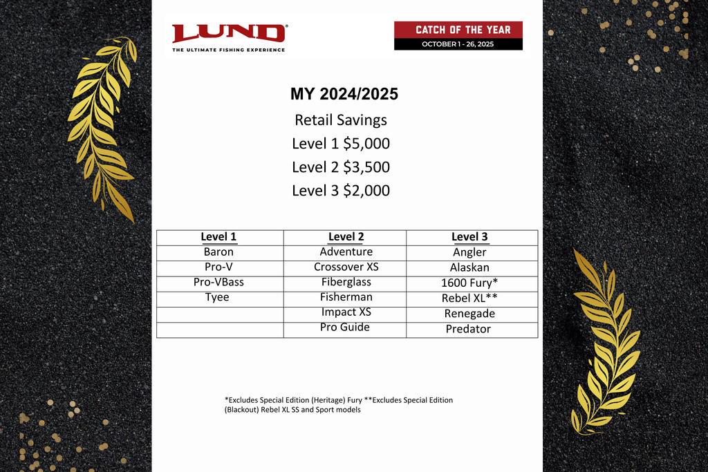 October 1st -26th, 2025. Save up to $5,000 on select 2024 and 2025 Lund models. See the detail sheet for breakdown of models and applicable discounts.